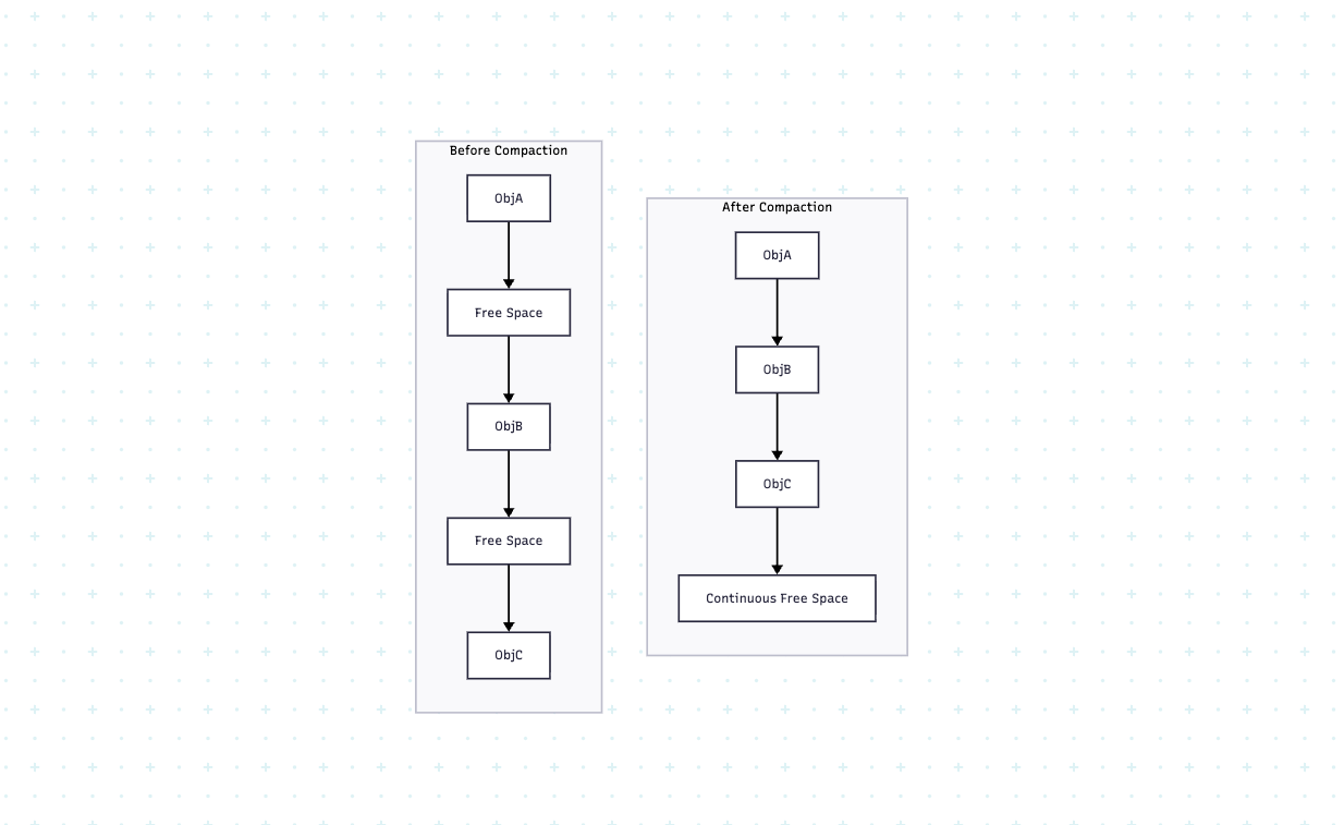 - Before Compaction: Objects are scattered across memory, leaving gaps of unused space in between.